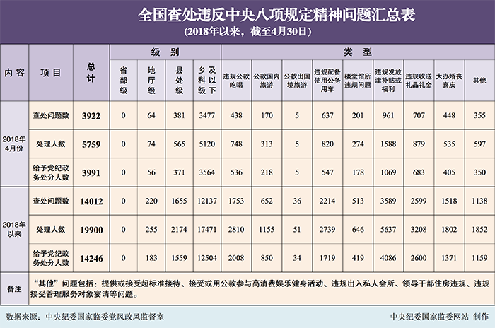 为掌握全国贯彻落实中央八项规定精神情况,中央纪委在各省区市和新疆生产建设兵团、各中央和国家机关、各中央企业和中央金融企业等建立了落实中央八项规定精神情况月报制度。2018年以来,截至4月30日,全国查处违反中央八项规定精神问题情况如下: